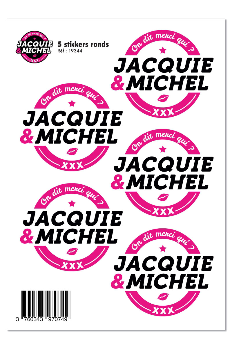 Planche de 5 autocollants ronds avec logo blanc Jacquie & Michel.