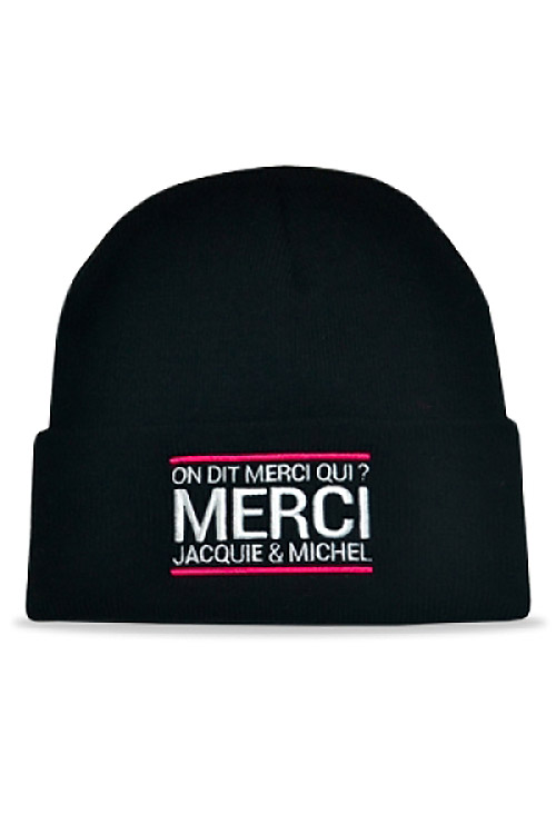 Bonnet avec slogan Jacquie et Michel, disponible en noir ou blanc