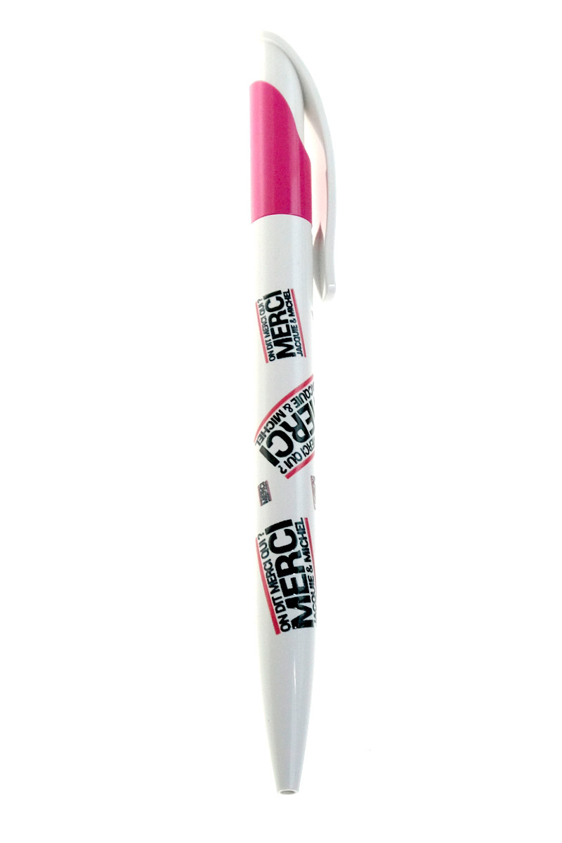 Stylo à bille rétractable avec corps et clip en plastique blanc, partie supérieure fuchsia, encre noire.