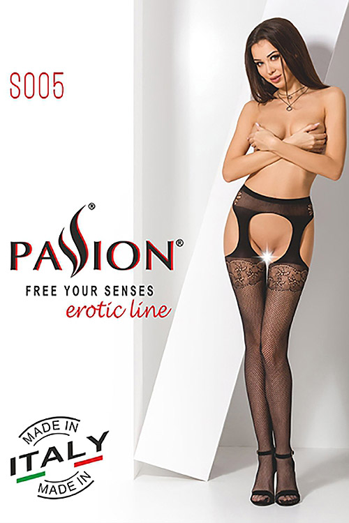 Collants ouverts fantaisie en résille noire avec quatre jarretelles intégrées.