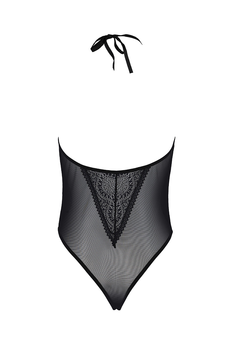 Fermé derrière le cou par des bretelles nouées, le body au profond décolleté couvre les seins de dentelle. Bien élaboré, il possède une ouverture à l'entrejambe par un gousset à agrafes ajustable. La finition string met joliment en valeur les fesses.