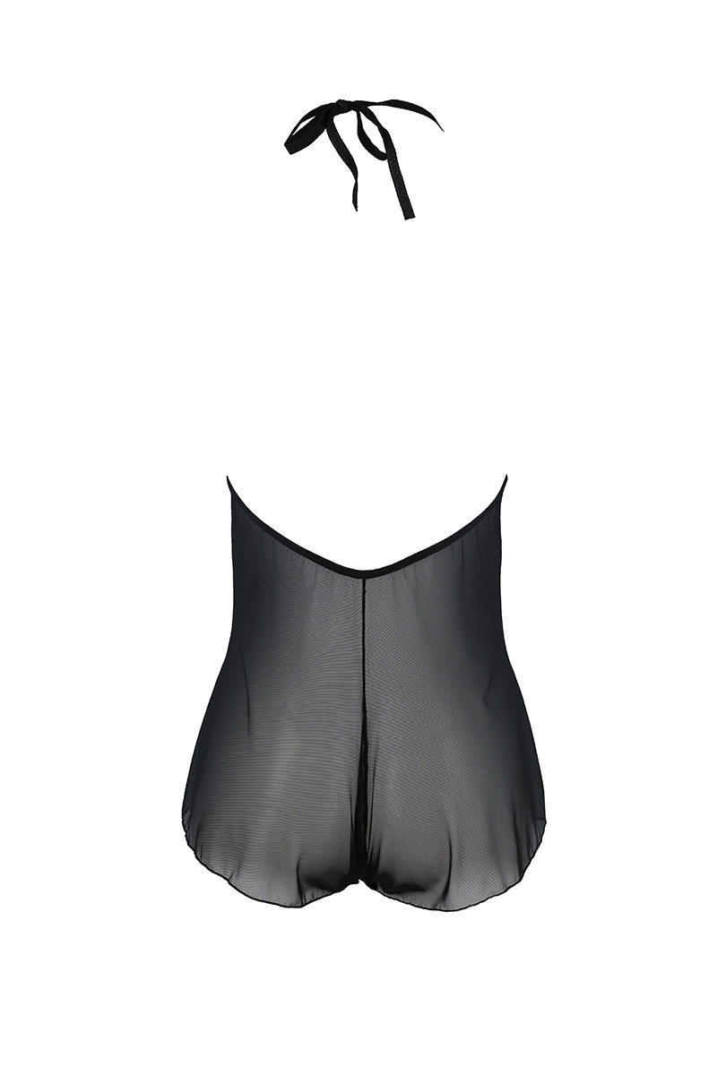 Fermé derrière le cou par des bretelles nouées, le body au profond décolleté couvre les seins de dentelle. Bien élaboré, il possède un gousset de coton pour le confort, et la finition shorty met joliment en valeur les fesses.