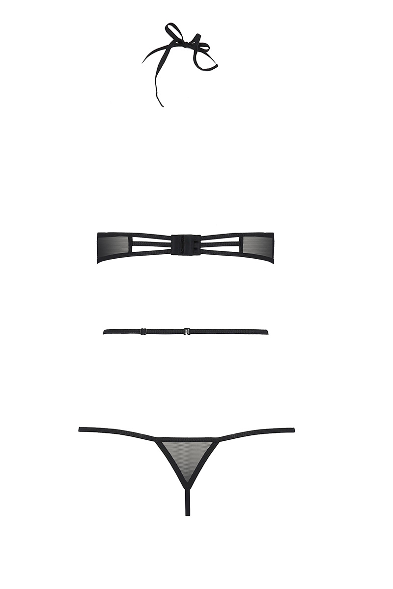 La partie soutien-gorge découvre les seins et présente de fines lanières horizontales, verticales et une fine bande de tissu sous les seins apporte du soutien à la poitrine.