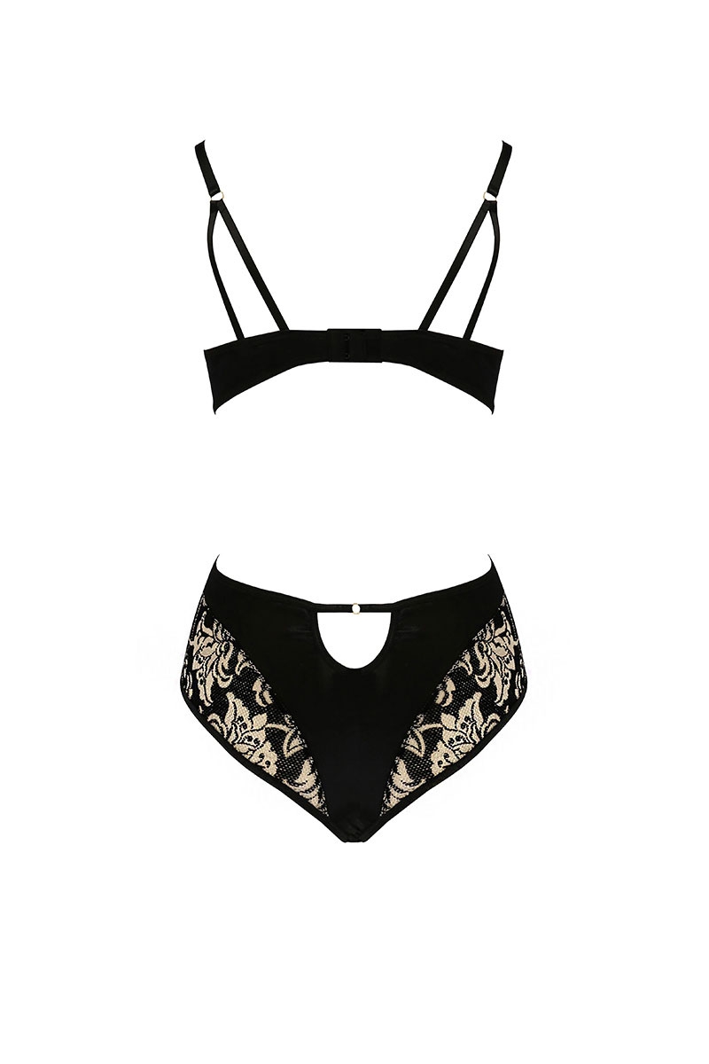 Jolie composition de tissus noir extensible éclairé par une élégante résille bicolore noire et or imprimant des motifs baroques, ce body possède des bonnets balconnets à armatures qui mettent bien la poitrine en valeur.