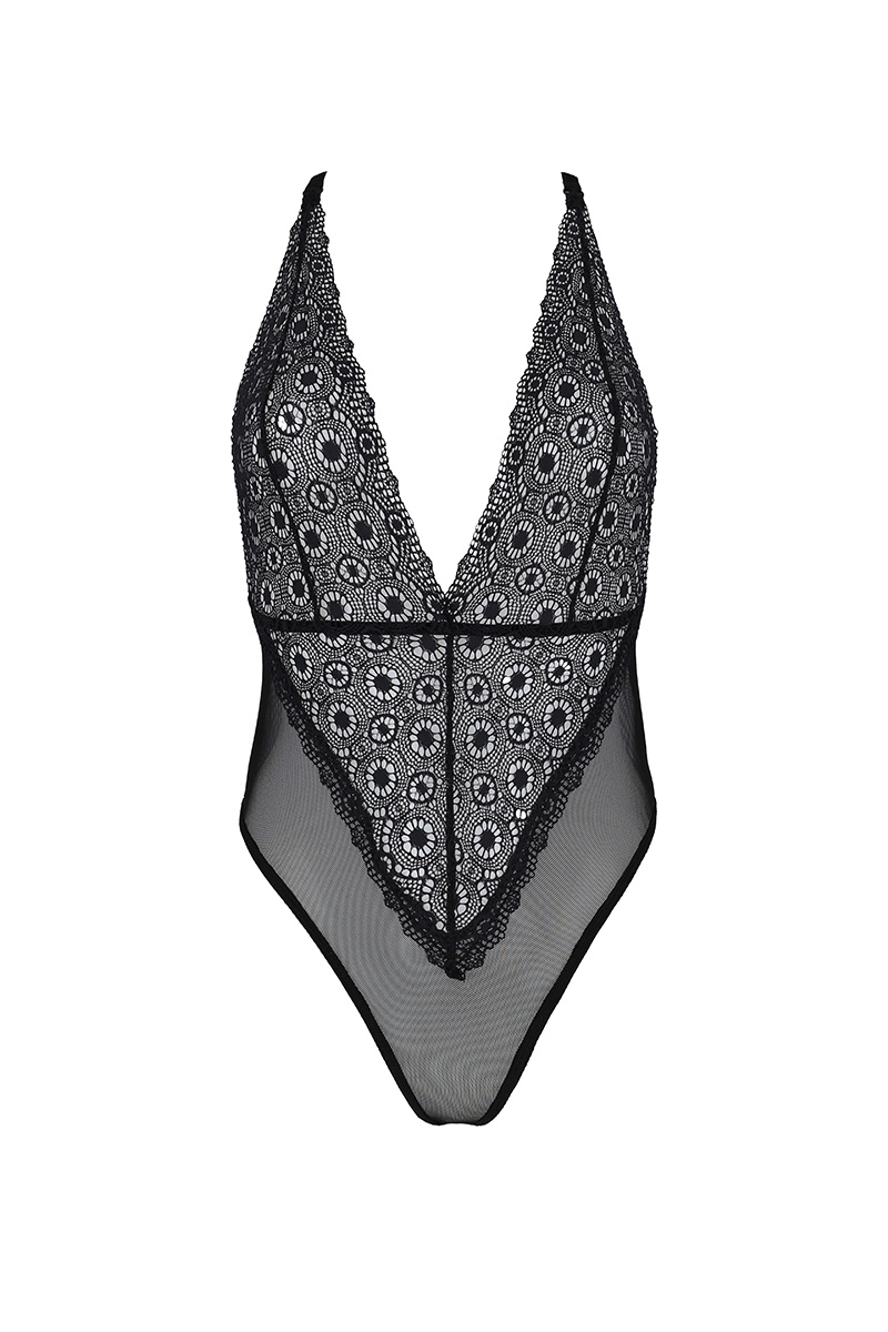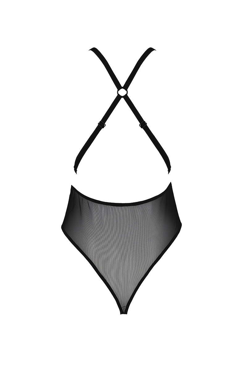 Le soutien-gorge est formé de deux pans étroits de dentelles qui couvrent les seins et se finit en un profond décolleté. Bien élaboré, il possède une ouverture à l'entrejambe par un gousset à agrafes ajustable. La finition échancrée met joliment les fesses en valeur.