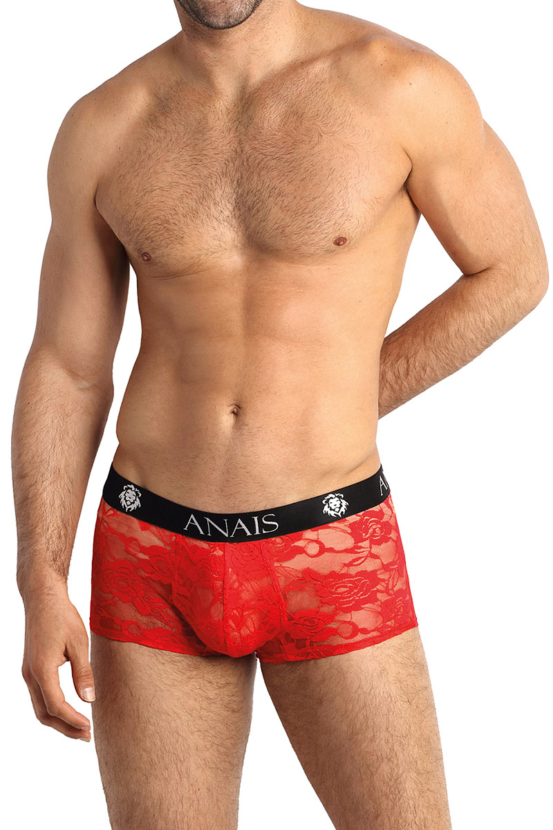 Le boxer Brave. La large ceinture élastique noire décorée de têtes de lion et du logo de la marque maintient parfaitement ce boxer en place accompagner chacun dans les moments calmes comme intenses. Ce boxer sexy est fabriqué en dentelle rouge au motif floral qui crée des zones de transparence.