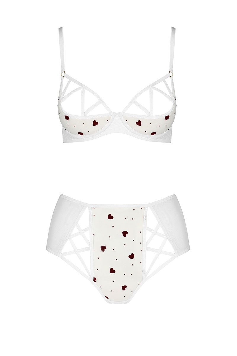Coupé dans un tulle blanc transparent floqué de coeurs rouge foncé, cet ensemble érotique est plein de charme.