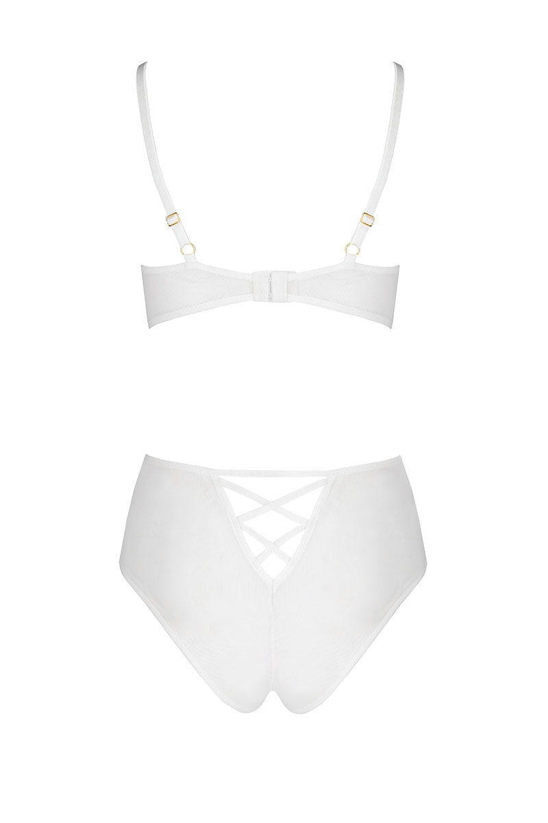 Les bonnets en demi-cup renforcés par des baleines et une coque souple mettent bien en valeur la poitrine exhibée en seins nus. Joliment travaillée, la culotte est parfaitement assortie.
