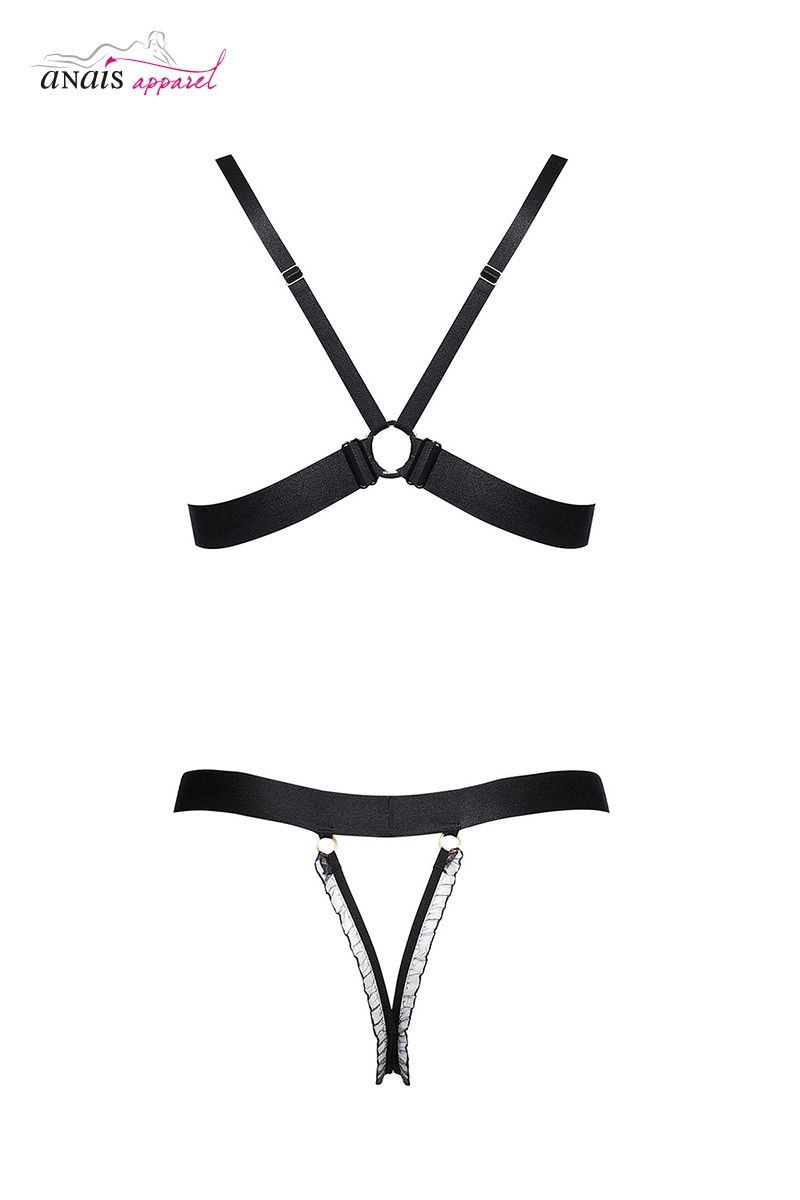 Soutien-gorge et string rouge bordé de fronces noires, avec un large anneau au creux du décolleté et dans le dos.