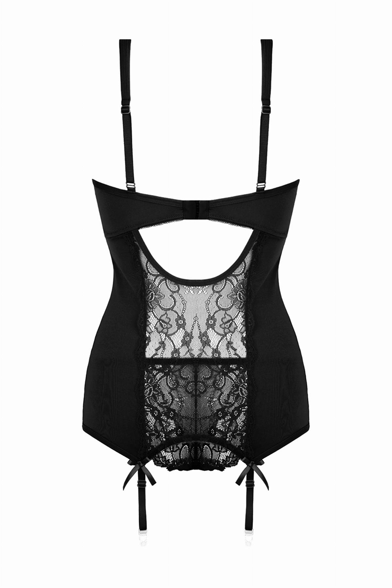 L'ensemble de lingerie 2 pièces Marzia, by Christine le Duc, est composé d'une guêpière noire et d'une culotte en dentelle assortie.