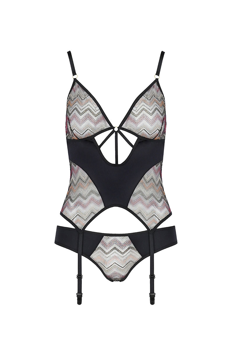 Riche en détails et fantaisies, cet ensemble en maille noire satinée et tulle à chevrons colorés soulignés de fils dorés, possède quatre jarretelles réglables pour attacher des bas (non fournis).