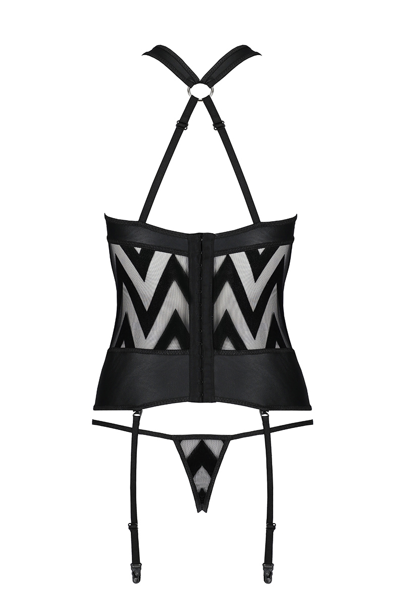 Ensemble guêpière et string en faux cuir mat fin et souple, et tulle décoré de chevrons de velours.