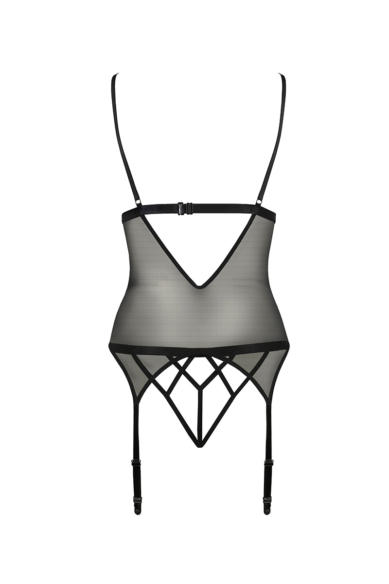 Au niveau de la guêpière, le soutien-gorge ouvert présente des détails de dentelle. Le haut et le bord des seins sont décorés par de la dentelle et une forme de croix est tracée en fines lanières au creux du décolleté.
