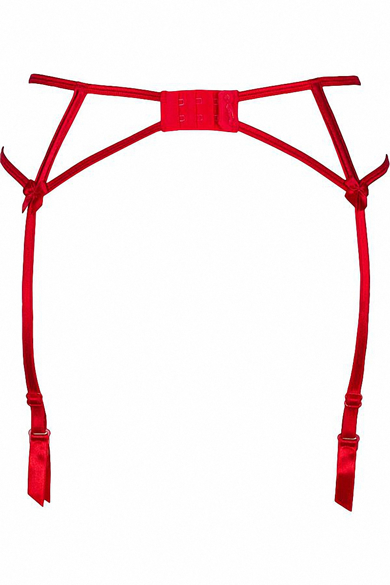 Les élastiques rouges qui structurent le porte-jarretelles sont continués par quatre jarretelles réglables. Gainé de tiges de renfort sur les côtés et dans le dos, il est fermé derrière par une attache à agrafes ajustable sur trois positions.