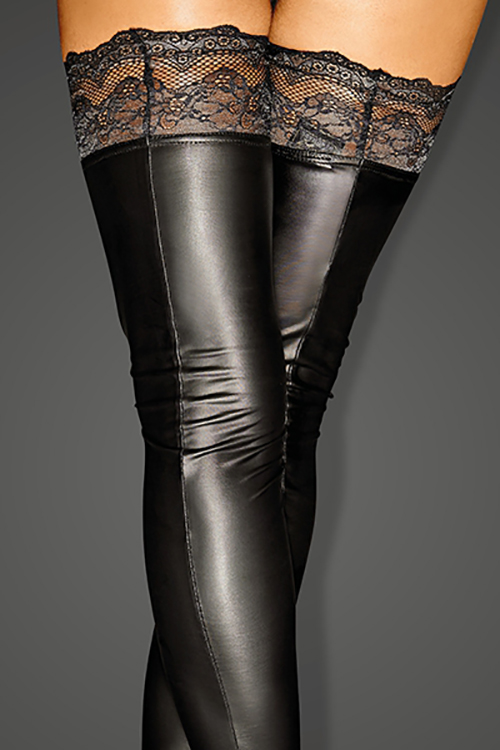 Paire de bas sans pieds en wetlook noir, avec jarretières dentelle auto-fixantes grâce à des bandes de silicone placées au revers.