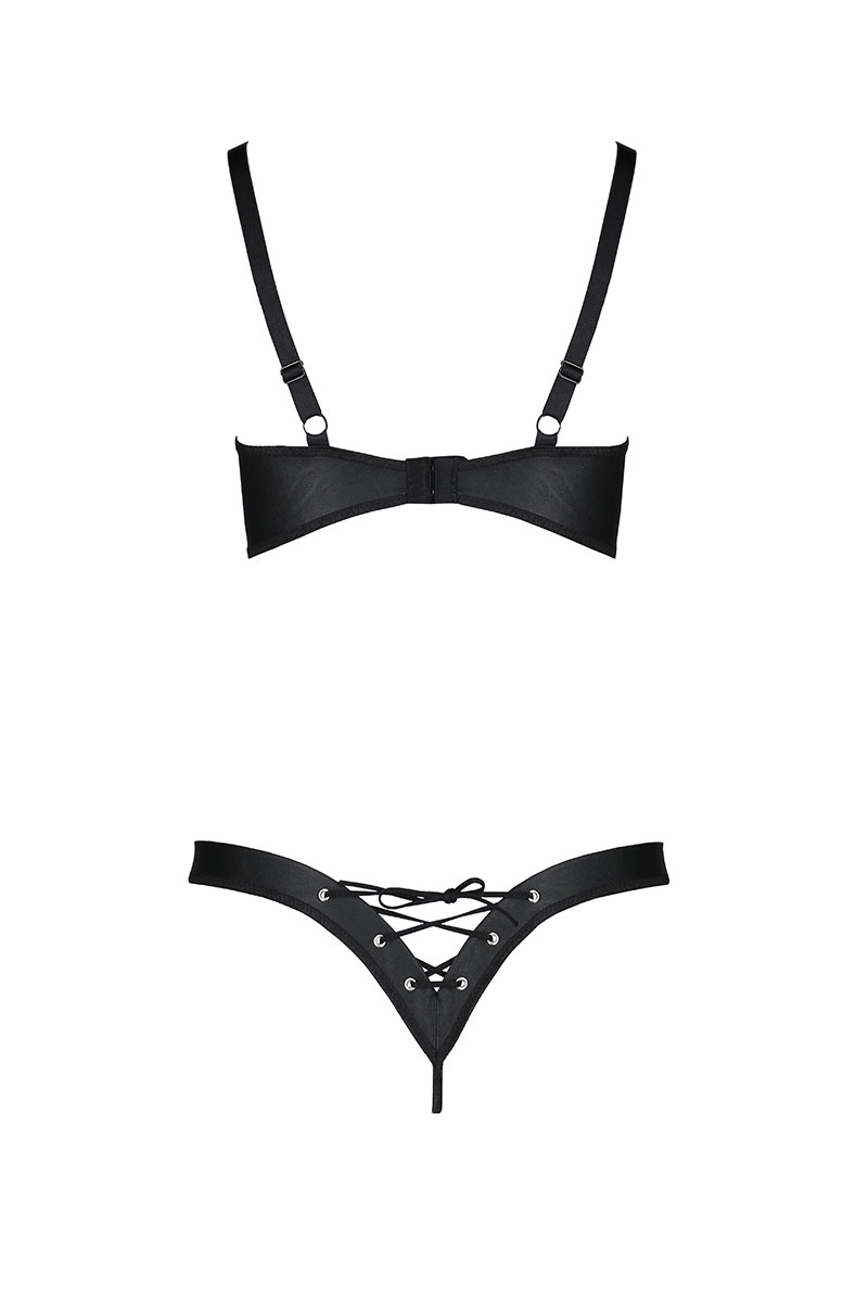 Lingerie sexy fantaisie en faux cuir noir mat, soutien-gorge ouvert et string lacé.