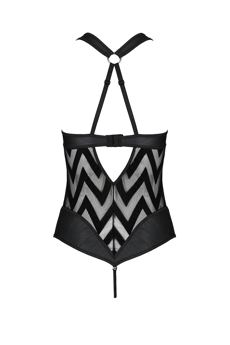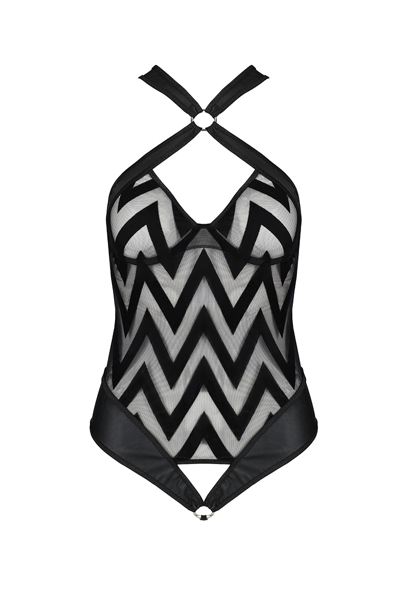 Body string noir en faux cuir fin et souple, et tulle décoré de chevrons de velours.