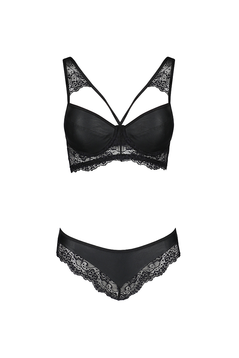 Glamour de la dentelle, fetish du faux cuir, cet ensemble de lingerie est de la séduction pure.