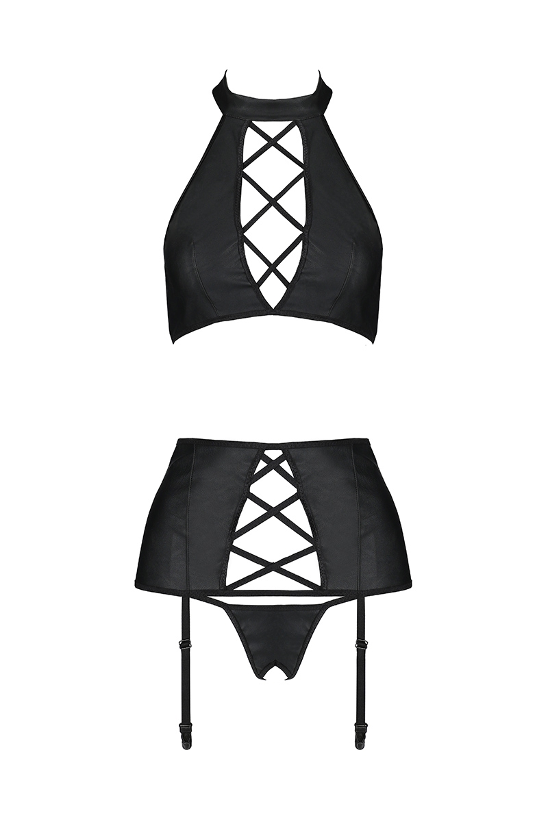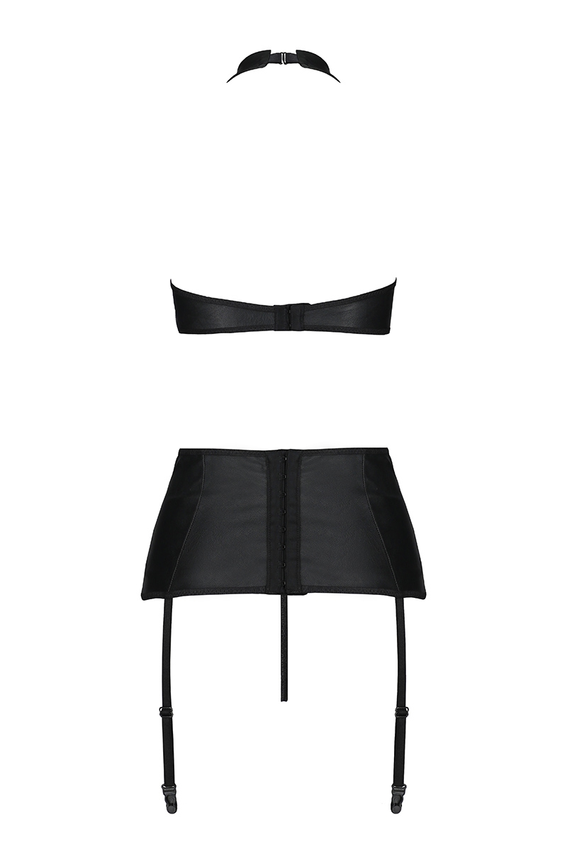 Ensemble de lingerie faux cuir composé d'un bustier dos nu, d'un porte-jarretelles, et d'un mini string ouvert.