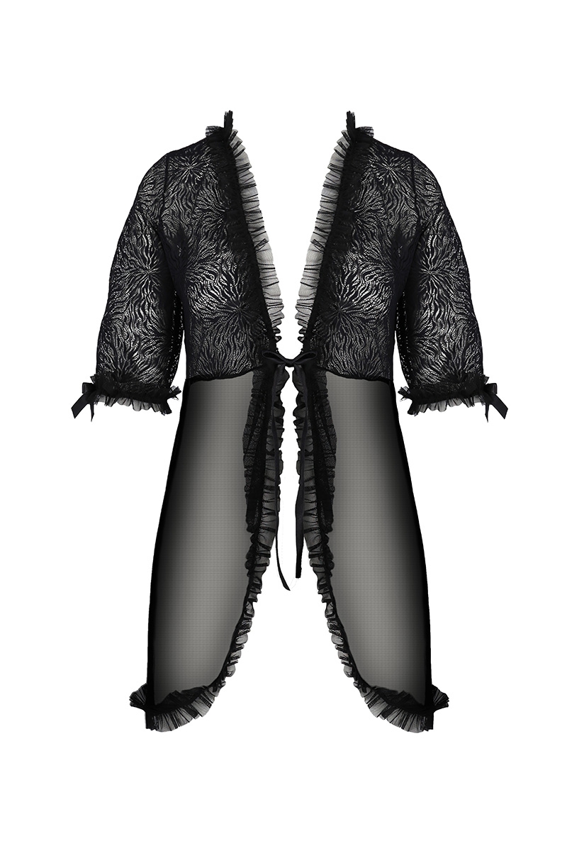 Lingerie d'intérieur sophistiquée, le déshabillé Selaginella est un peignoir élégant. La dentelle soignée aux motifs effilés, combinée avec le tulle finement ajouré et transparent, composent un déshabillé aux détails soignés et charmants : la finition en fronces en bas des manches et autour du déshabillé, et les noeuds de ruban qui décorent les manches en harmonie avec l'attache à nouer sur le décolleté profond.