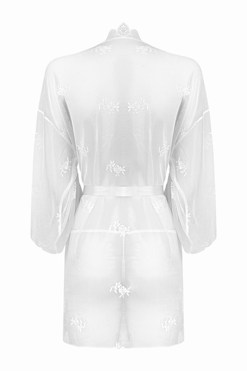 La marque de lingerie Christine présente Flower, un magnifique déshabillé blanc transparent en dentelle luxueuse et délicate, livré avec sa ceinture et son string assortis.br />