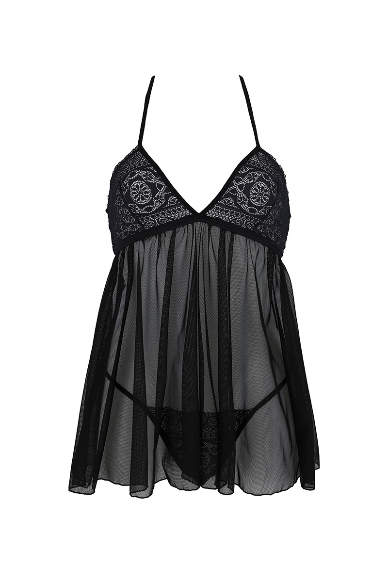 Lingerie d'intérieur élégante et provocante, la nuisette Kerria et son string assorti, possède un style moderne et sensuel. La dentelle soignée aux riches motifs baroques compose un soutien-gorge sans armatures aux bretelles croisées dans le dos. La robe transparente de tulle finement ajouré, répand ses fronces légères jusqu'en haut des cuisses, où on découvre le string doublé d'un gousset de coton parfaitement assorti.