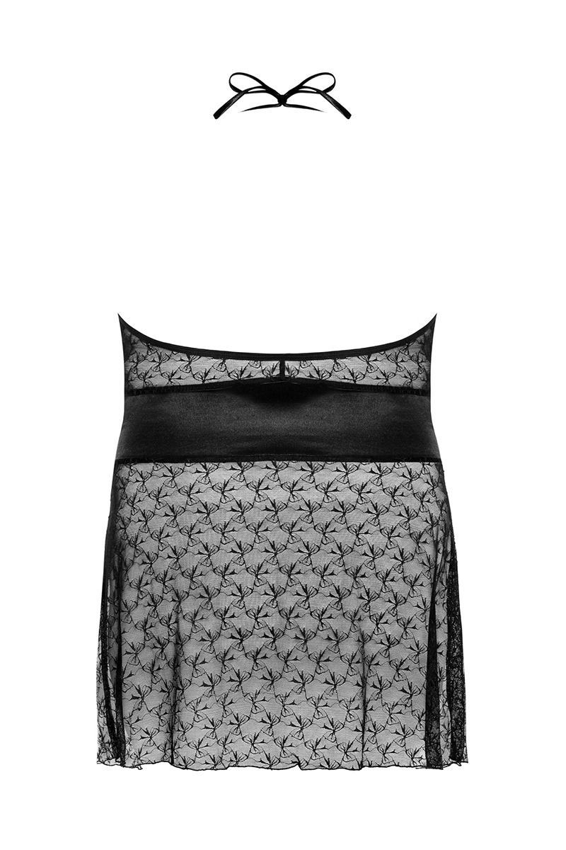 Le soutien gorge sans armature se noue dans le cou pour plus de confort, au milieu de la poitrine se trouve un ruban noué comme un corsage qui donne un effet ultra sexy cette nuisette. Ce soutien-gorge laisse le dos nu.