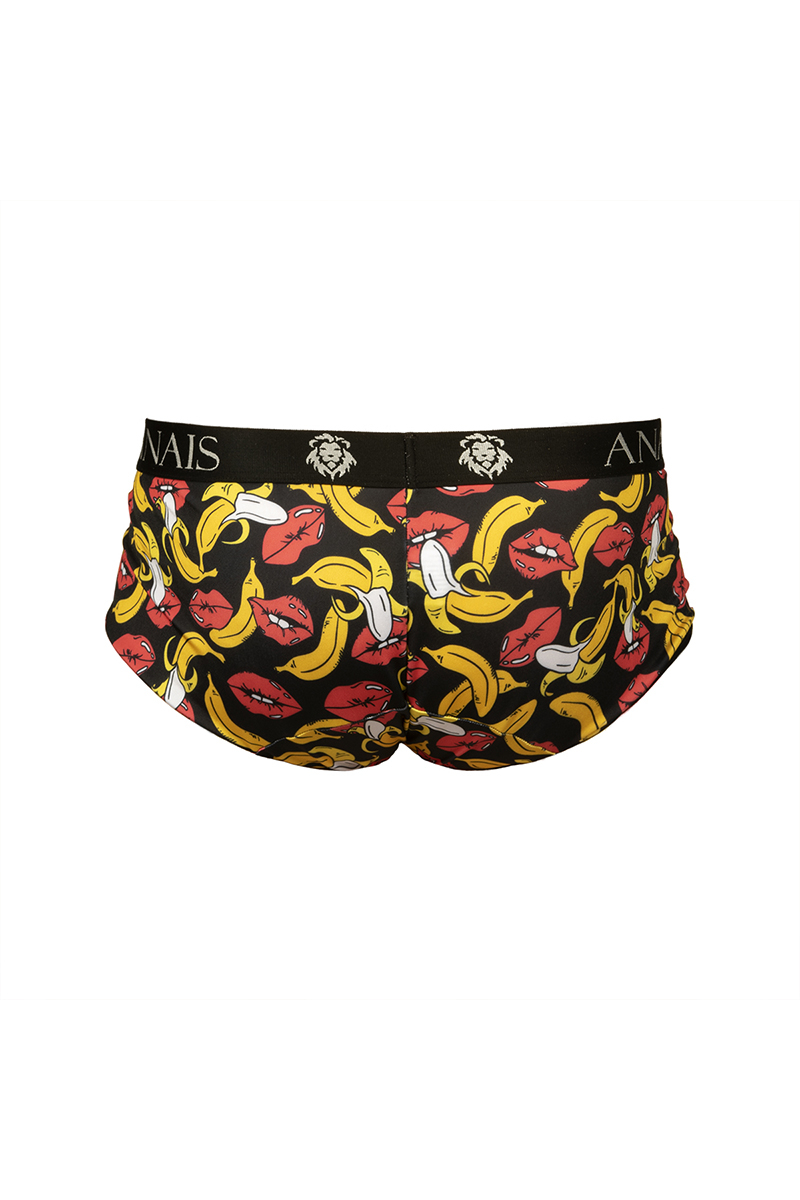 Le shorty Banana. La large ceinture élastique noire décorée de têtes de lion et du logo de la marque maintient parfaitement ce shorty en place accompagner chacun dans les moments calmes comme intenses. Ce shorty sexy est fabriqué en tissu noir au motif de bananes et bouches sexy.