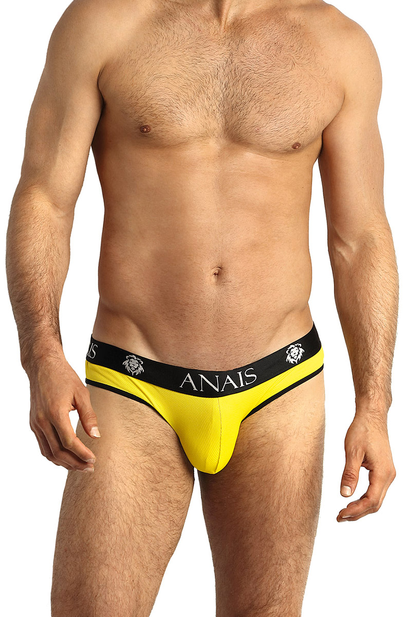 Le slip Tokio. La large ceinture élastique noire décorée de têtes de lion et du logo de la marque maintient parfaitement ce slip en place pour offrir un confort parfait tout au long de la journée. Ce slip sexy est fabriqué en Tissu jaune texturé esprit gaufré.