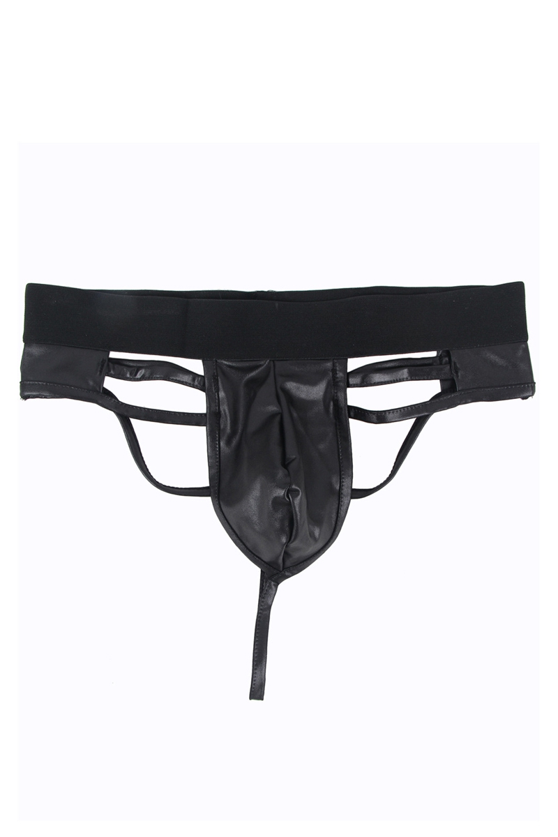 Un string noir dans un look fétichiste avec et tissu wetlook et ornements sur le devant et le derrière.