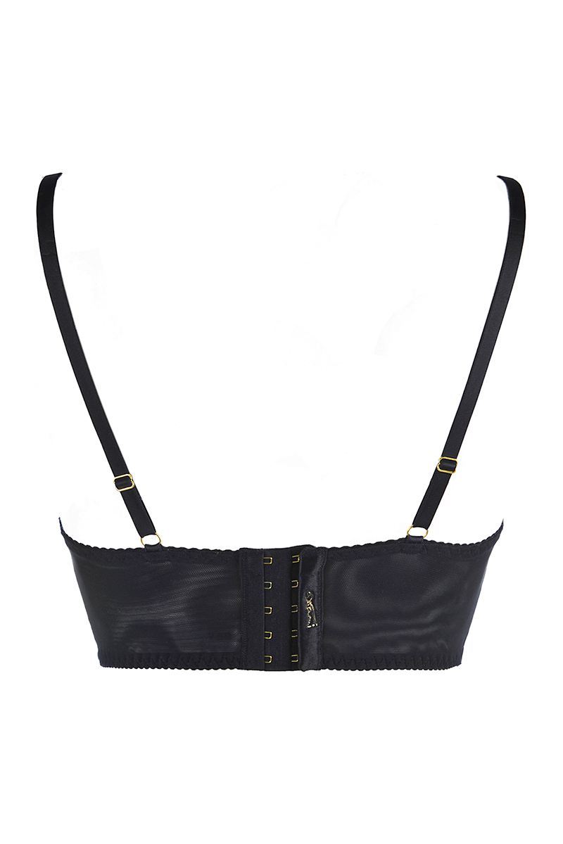 Soutien-gorge bustier à armatures, en fine dentelle noire et tulle brodé, pour un maintien en beauté de la poitrine.