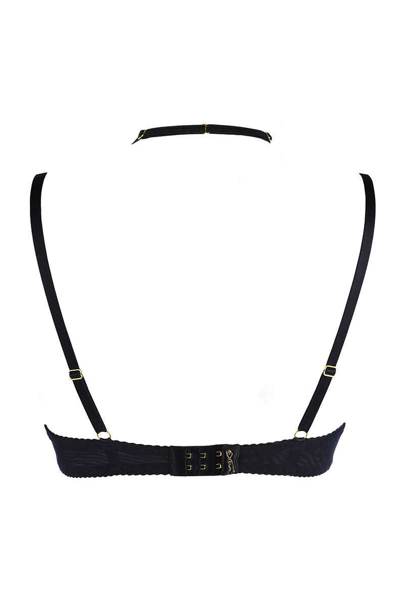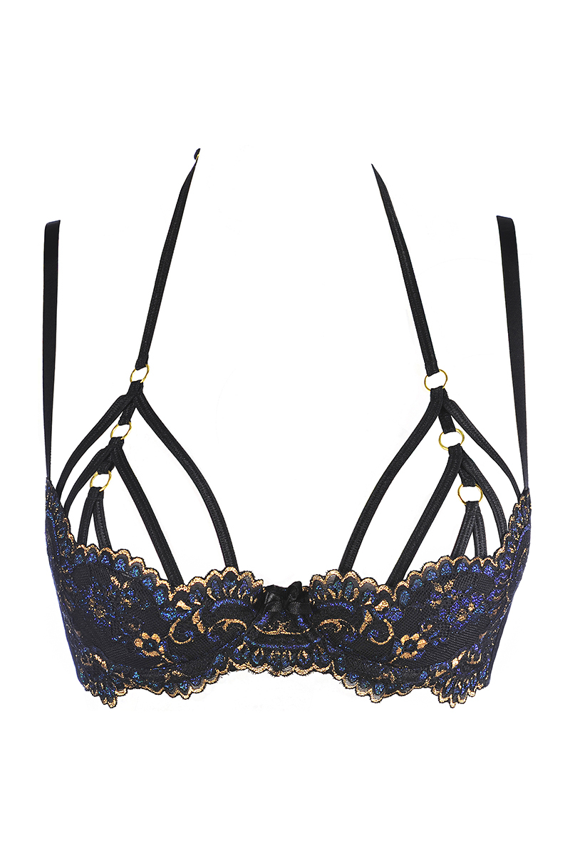 Soutien-gorge lingerie aux bonnets ouverts en tulle noir doublé et broderies aux reflets or et bleu par la marque Axami.