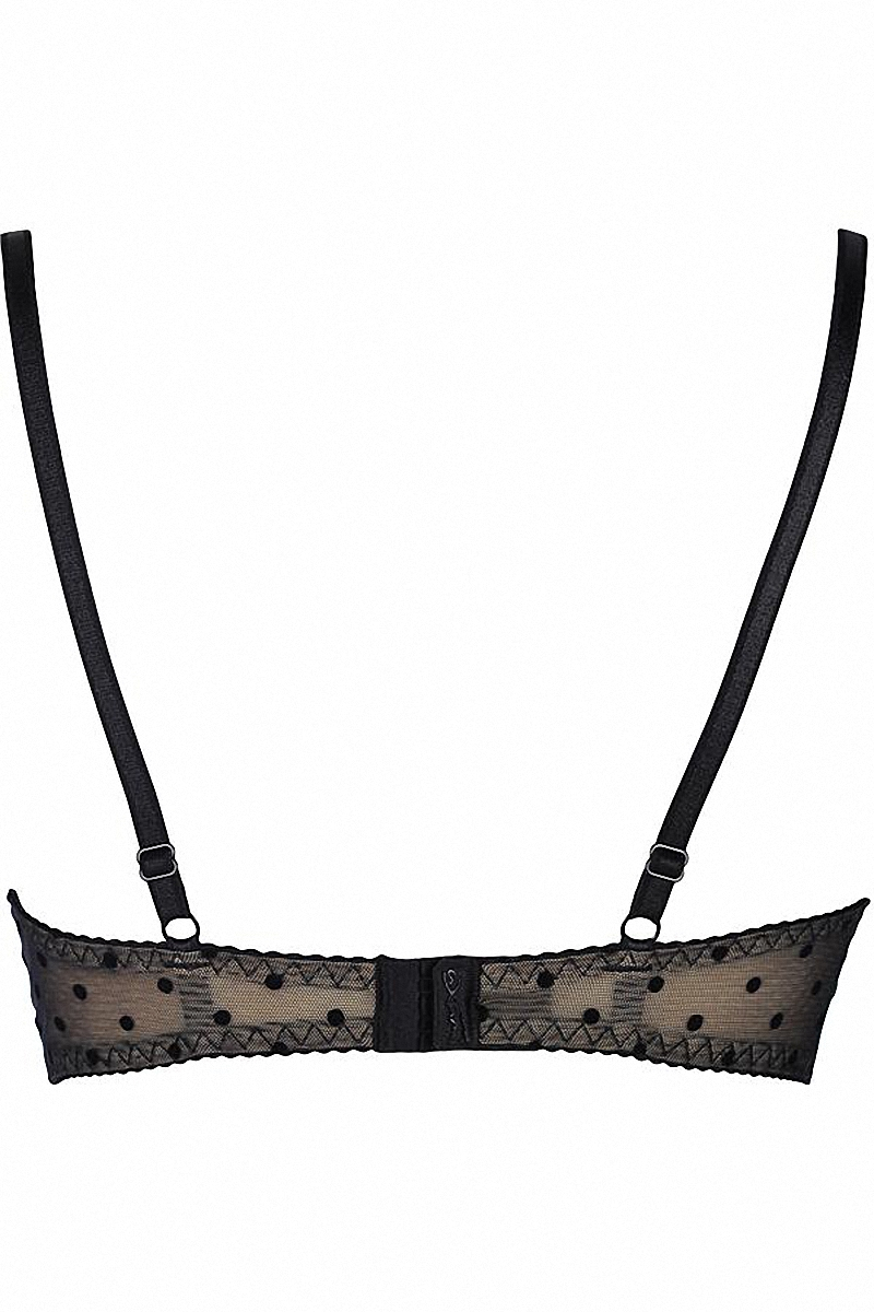 Soutien-gorge à balconnets pigeonnant en tulle noir floqué d'un motif de pois et tulle beige transparent, qui forme un ensemble raffiné et élégant avec le String noir V-9058 - Axami.