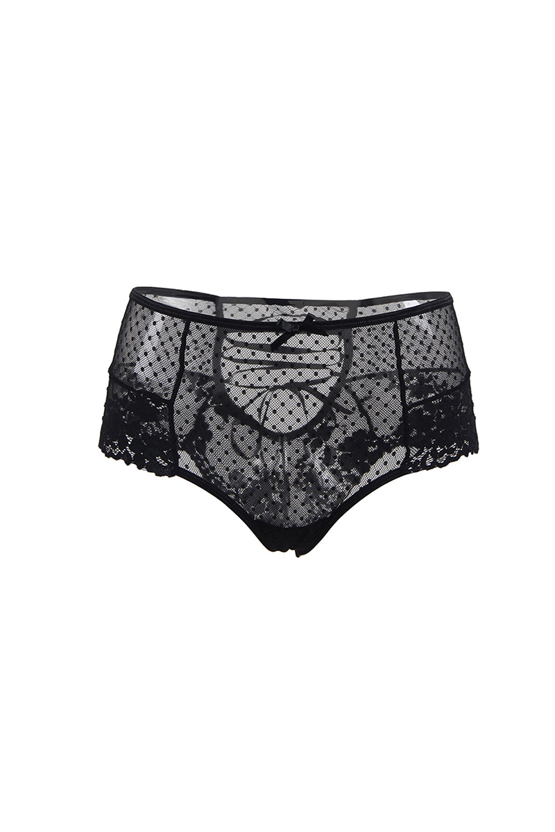 Superbe tanga noir taille haute fait de maille et dentelle. Il est ajouré sur les reins et propose un laçage satiné noir.