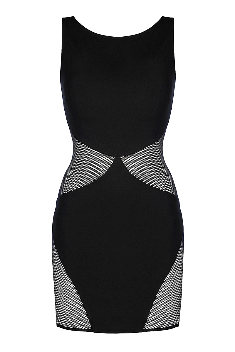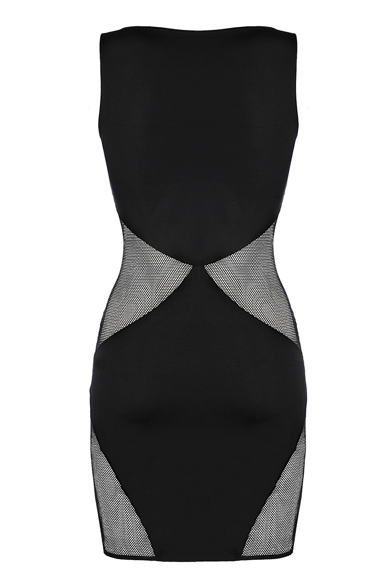 La marque Axami présente la robe noire V-9289 de la collection Party at Ibiza, une robe courte et sexy, extensible, en microfibres, avec des zones transparentes en mailles ajourées au niveau de la taille et des hanches.