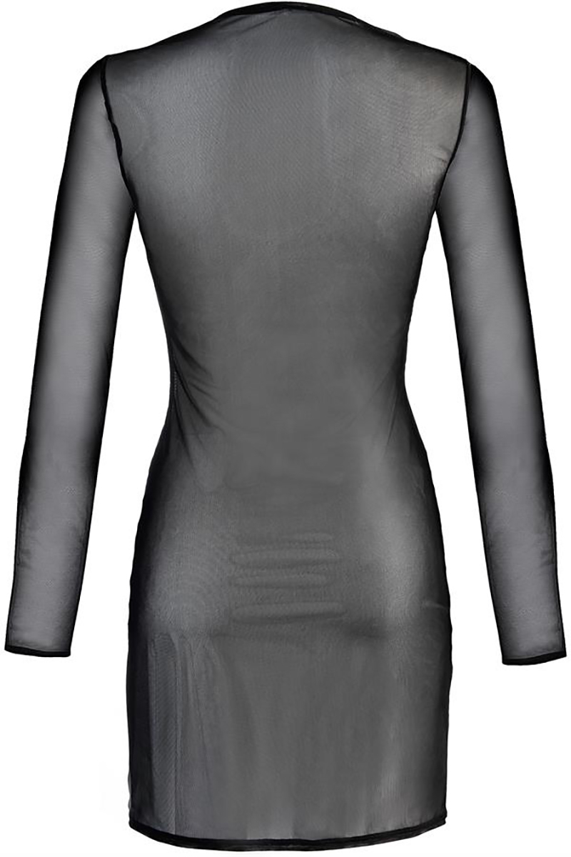 Sa coupe prêt du corps, son col rond et ses longues manches en font une robe au design sage mais aussi ultra sexy apporté par sa transparence.