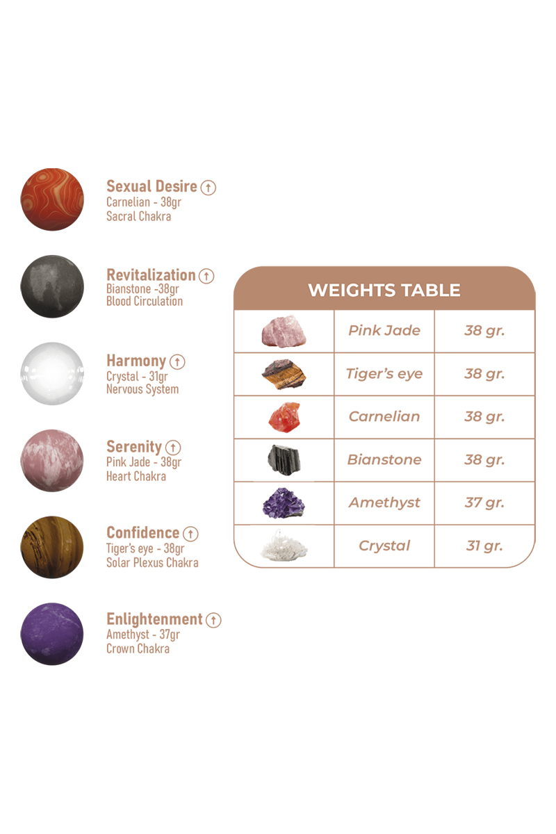 La marque Adrien lastic propose le coffret Harmony Stones Natural Kegel Ball, un coffret spécial exercices de Kegel, composé de six pierres différentes, interchangeables, aux bienfaits variés et de deux supports silicone pour boules de geisha (1 solo et 1 double).