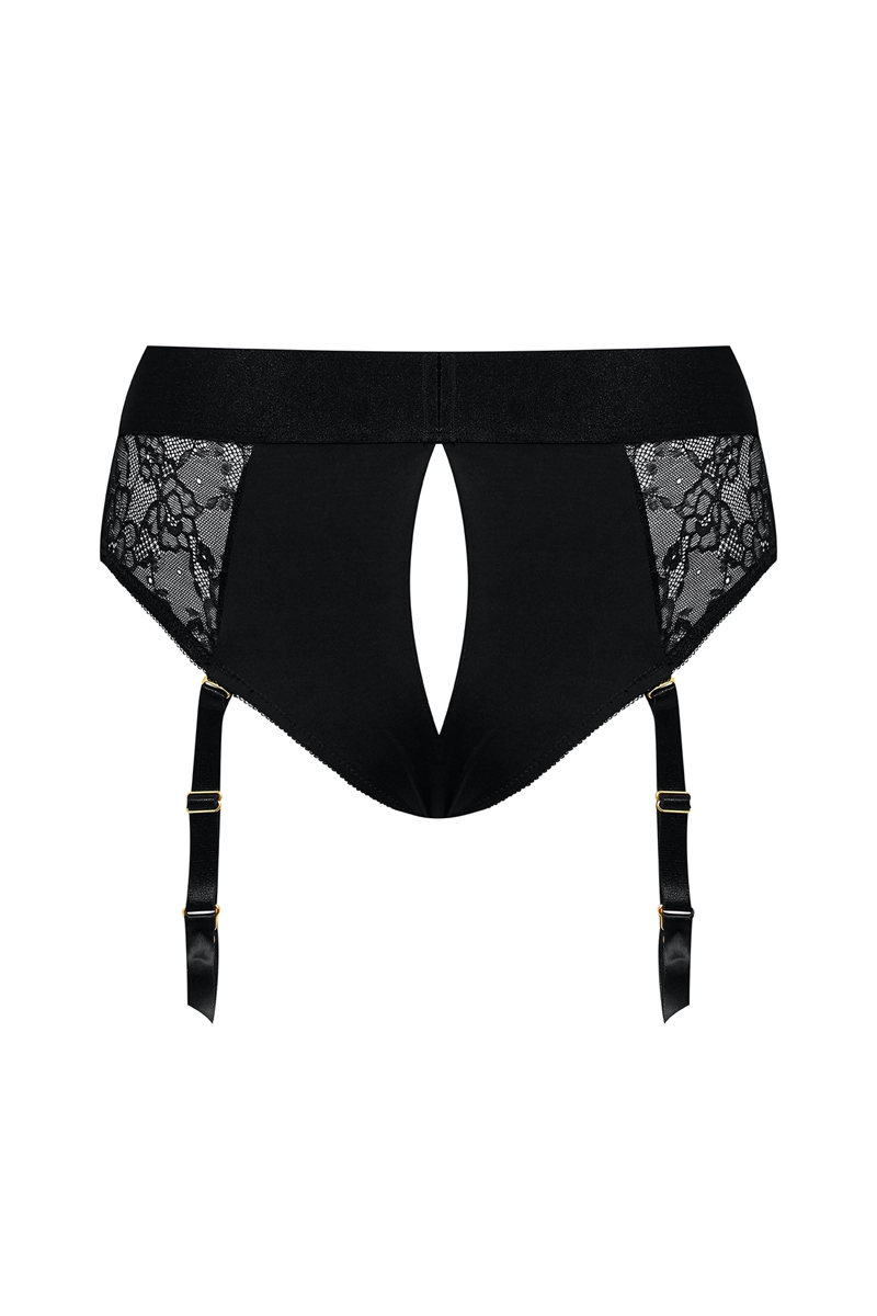Le harnais gode ceinture Diva de Strap-On-Me est un harnais lingerie avec culotte noire fendue sur les fesses et porte jarretelles en dentelle et microfibre.
