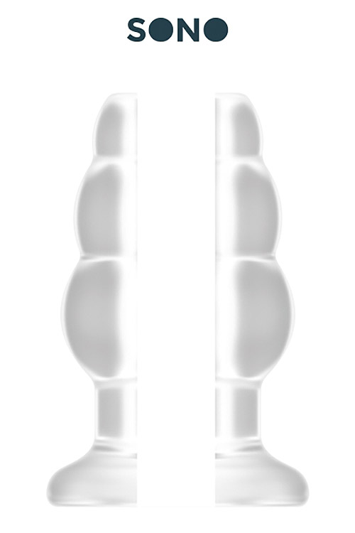 Plug anal translucide, creux au milieu, 10,2 cm de long par 5,7 cm de diamètre maxi.