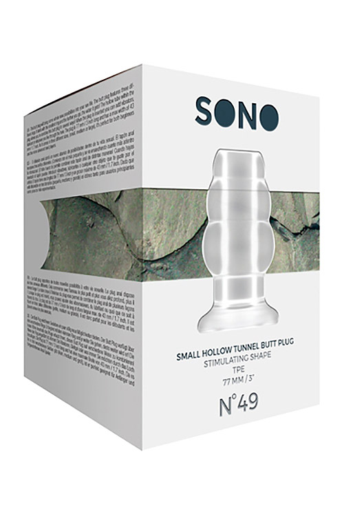 Petit plug anal translucide, creux au milieu, 7,7 cm de long par 4,3 cm de diamètre maxi.
